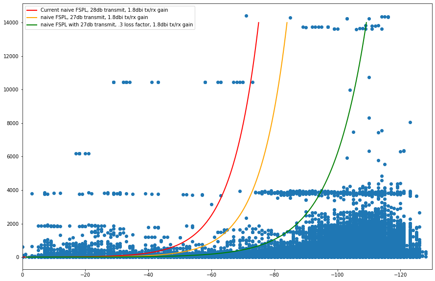 You're also seeing a bunch of blue dots. Those blue dots represent reported witness metrics of RSSI at some distance. The green line is the most restrictive, but is based on actual values of RSSI at some given distance, which is far more accurate than the current RSSI/SNR curve.