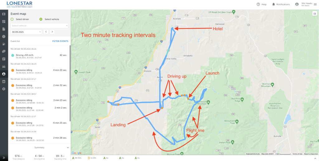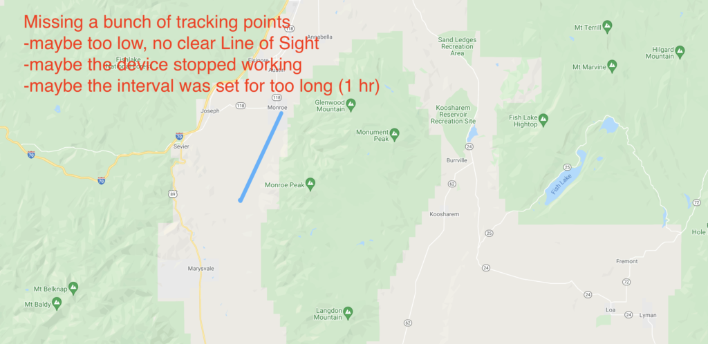 Third, using vehicle trackers to track paragliders is an excellent start, but free flight pilots in general (paraglider and hang gliders) need a few options that we hadn't configured in the trackers. Here's an example of the day in the life of a tracker, from the time I handed it out in the LZ (landing zone, which is where pilots in Monroe usually meet to start the day) all the way to the end of the day when the pilot went back to their hotel.