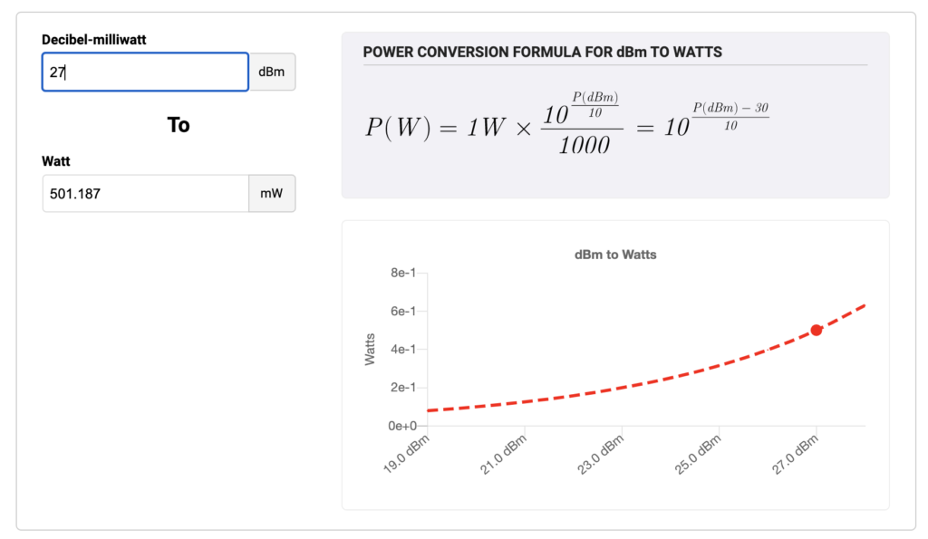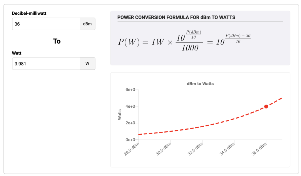27 dBm + 9 dBi = 36 dBm. So, how many watts is that? Let's cruise back to DigiKey's calculator and see.