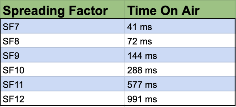 LoRa uses what is known as a “chirp” protocol and spreading factors (SF) are the duration of the “chirp”. Typically you’re looking at a range of SF7 to SF12 where the 7 is the shortest time on air. Each step up doubles the time on air to transmit the same amount of data and increases the range. Due to local restrictions, we are limited by max payload sizes to certain spreading factors, usually SF8 and SF9 for most packets.