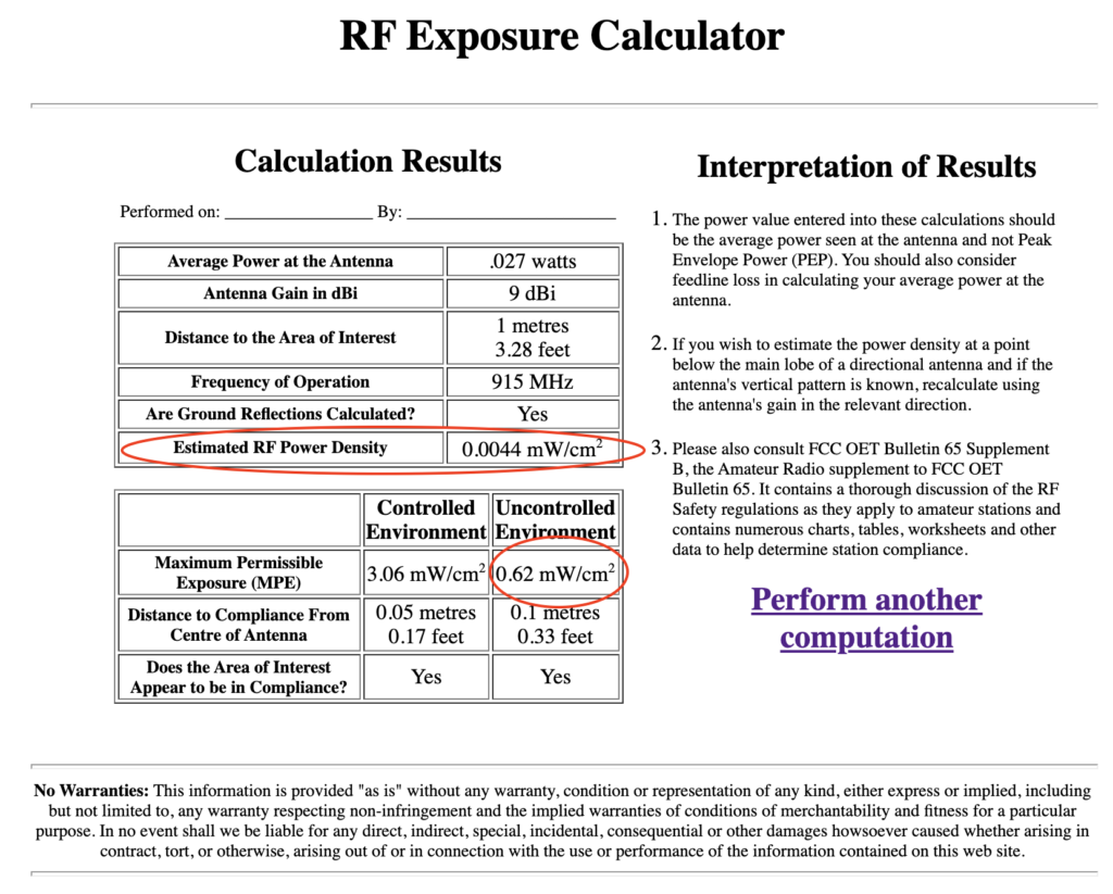 If it's in your house, it's unlikely that you hold your Helium Hotspot to your head. It's probably on a table or by a window. Let's say it's reasonable to be at least 3 feet away from the antenna at all times. We'll do a quick calculation check on that distance with the MAXIMUM POWER antenna to see what you're being exposed to, using HintLink's RF Exposure Calculator. By the way, a 9 dBi omni antenna (the maximum gain you can legally use) is about 4 feet long. Most people don't like the way a 4' long fiberglass pole looks inside the house.