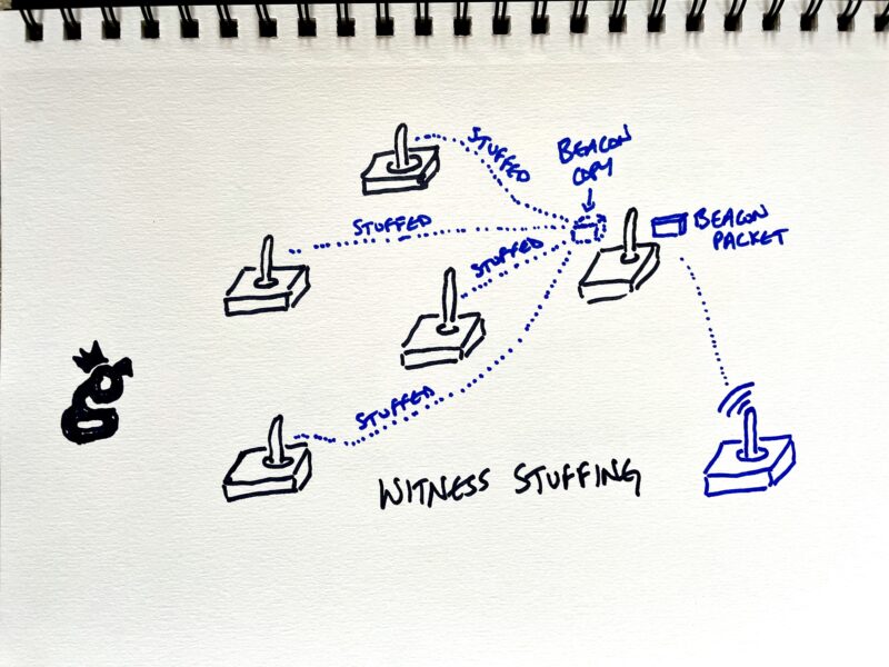 The second cheating method is known as Witness Stuffing. This is a software cheat. It's where you take a group of Hotspots that are all in the same general area and share all of the Beacons any of them Witness between them. In essence, when any one of them Witnesses a Beacon, it turns around and "stuffs" that same beacon into the rest of the group of Hotspots. The rest of the group doesn't have to actually Witness that beacon in order to earn from it.