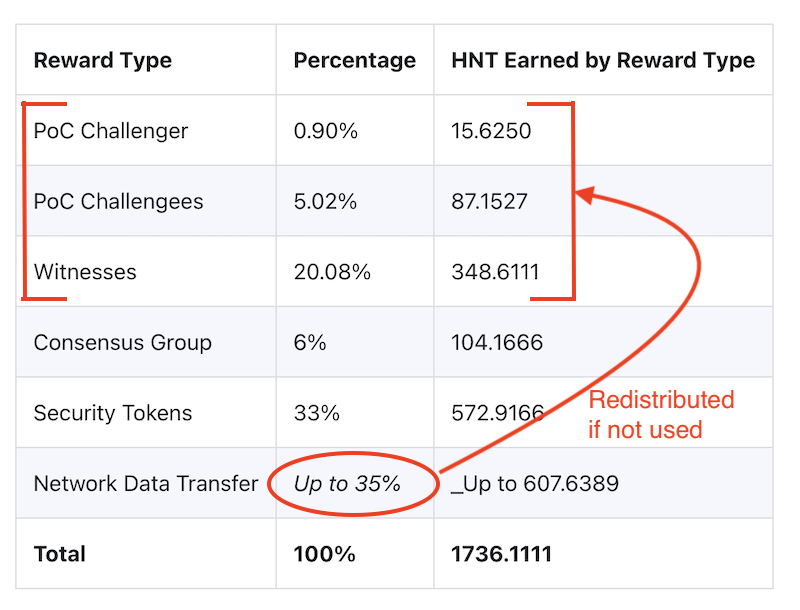 The catch (and really the current "doubling") is that if the "up to 35% of" HNT for data transfer doesn't get used, it gets redistributed to PoC rewards. That's us, running regular hotspots, collecting HNT for challenging, beaconing, and witnessing. Mostly, for witnessing, but that's another story.