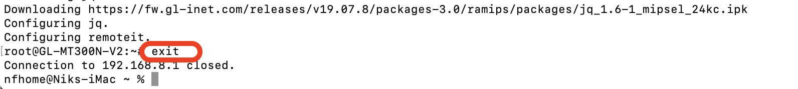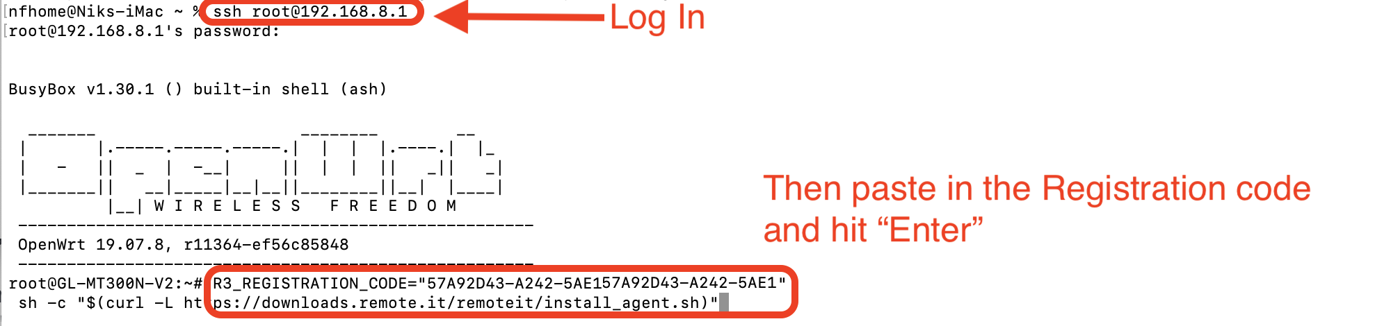 ssh root@192.168.8.1Again, the default password isgoodlifeif you haven't changed it. - Now that you're logged in to the Mango command line on Terminal, take the command you copied from the Remote.it website (