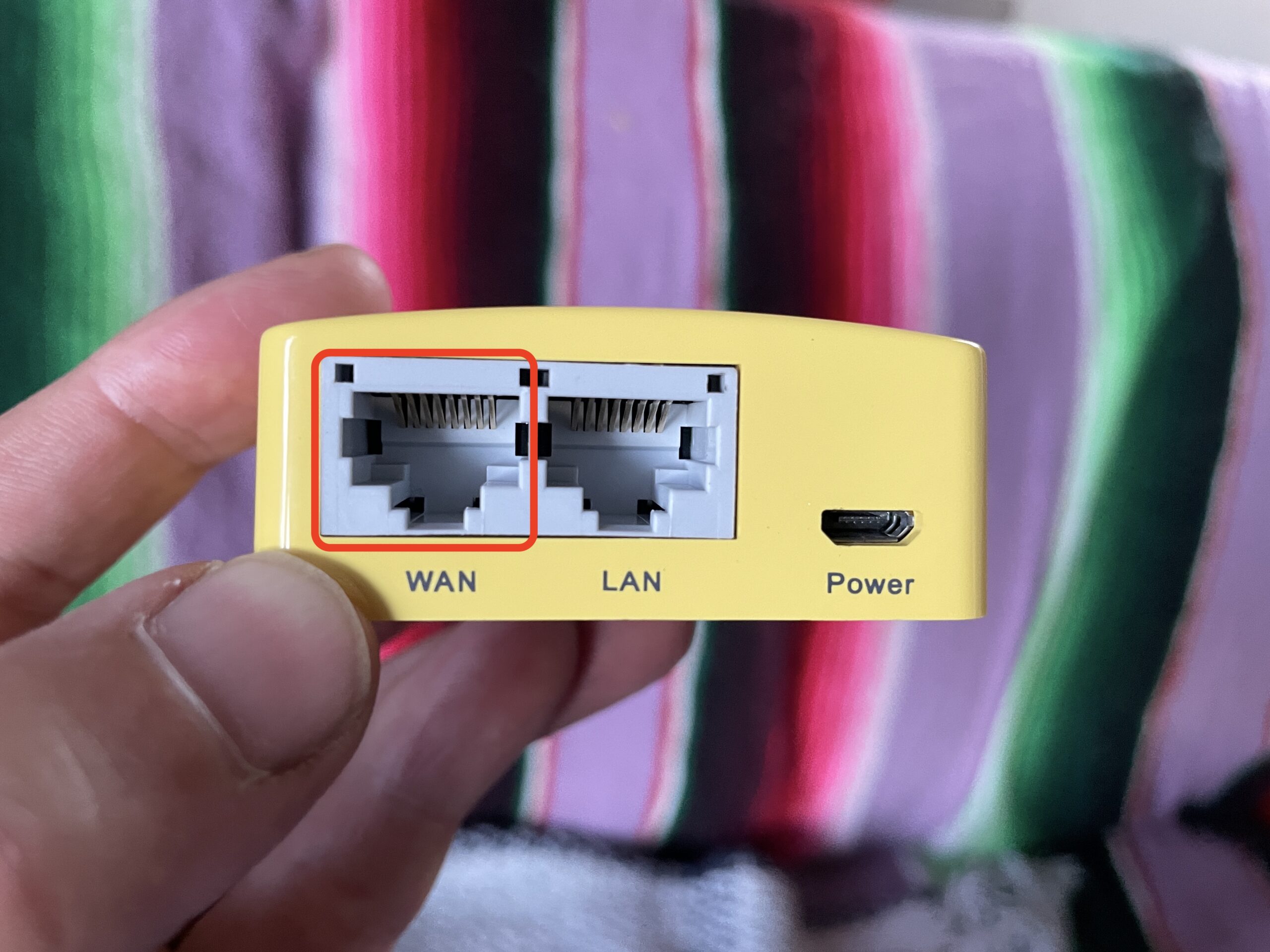 Over on the Mango, plug in power, then connect your Mango to your router with an ethernet cable. Use the WAN port on the Mango, and any LAN port on your router.
