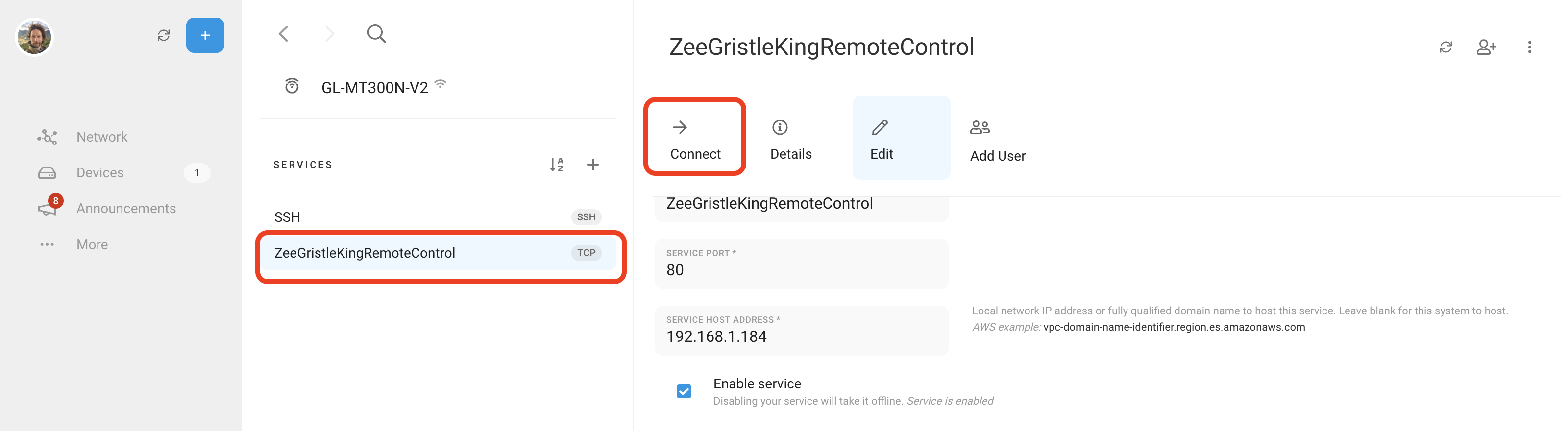 - You're done! Now, from anywhere in the world you can log into your Remote.it account, select the Mango your Hotspot is attached to, click on the Service you just set up, then hit "Connect".