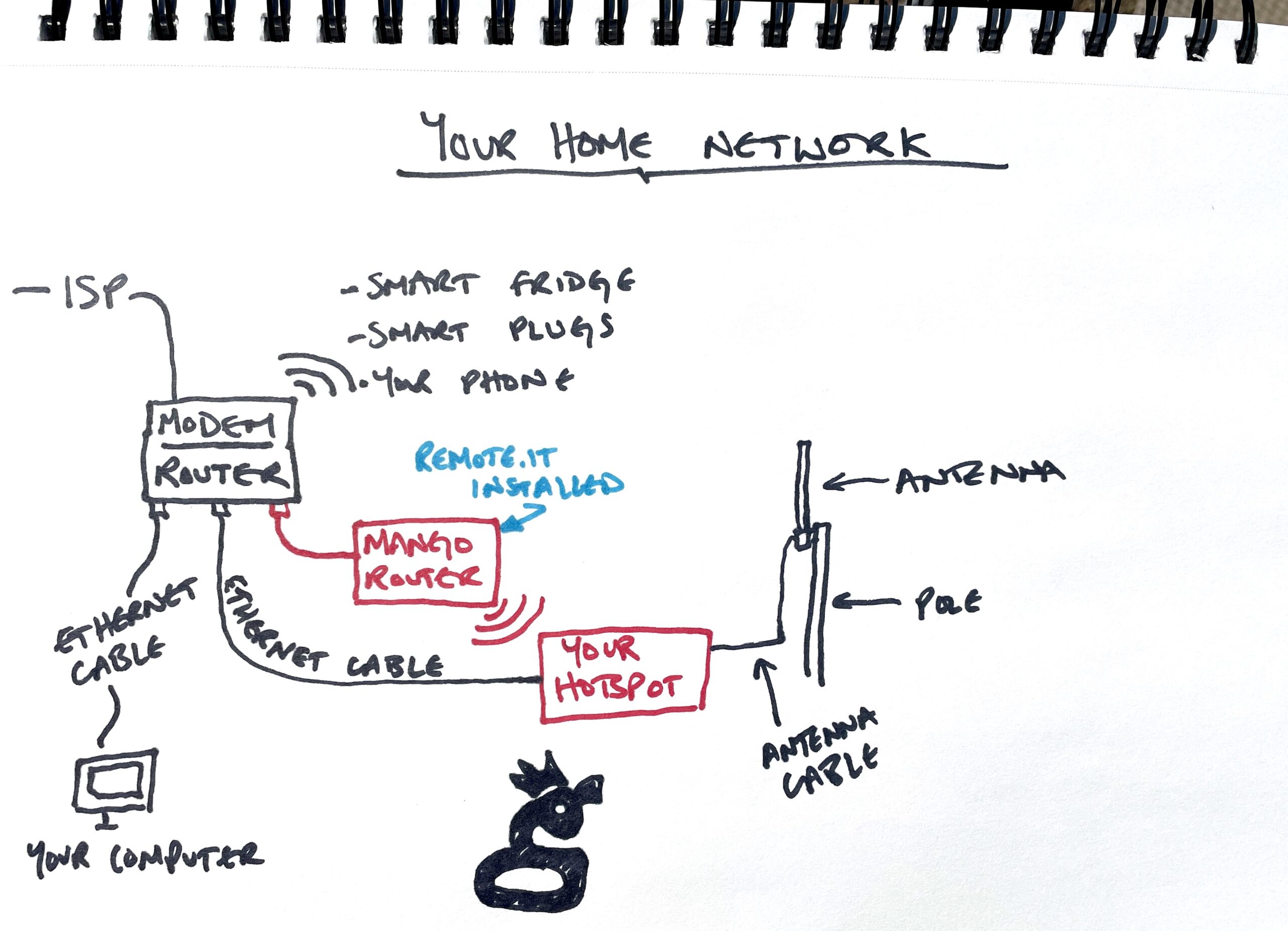 Every Hotspot is connected to a router. Most routers in the home are actually a combination of modem and router, and are more or less locked; you can't add new software like remote.it to them. What you CAN do is add another router that is more configurable, put remote.it on the extra router, and then create a connection from that 2nd router to your Hotspot. It sounds complicated, but it's really pretty easy. Let's walk through how to do it.