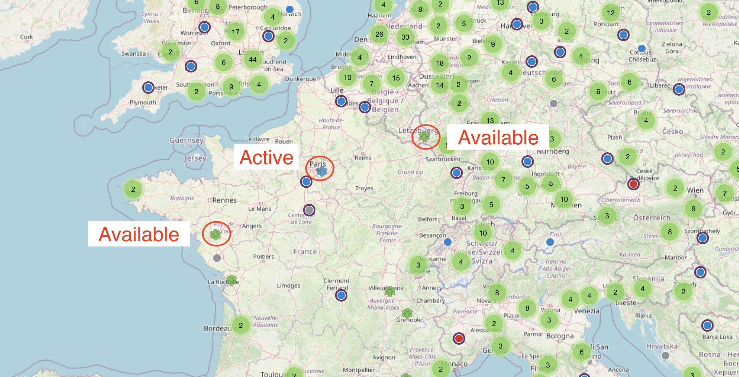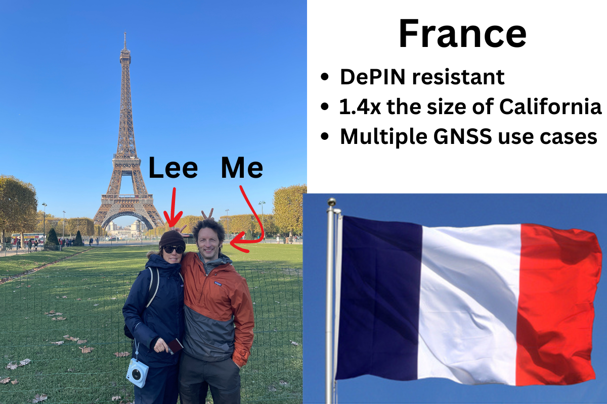 France is 213,000 sq miles; about ten times as big as the Central Valley. Each GEODNET miner can provide cm accuracy for about 120 square miles. To provide blanket coverage for France you’d need over 1,700 GEODNET miners. However…France doesn’t need perfect blanket coverage, but it does need wide coverage, especially in certain areas.