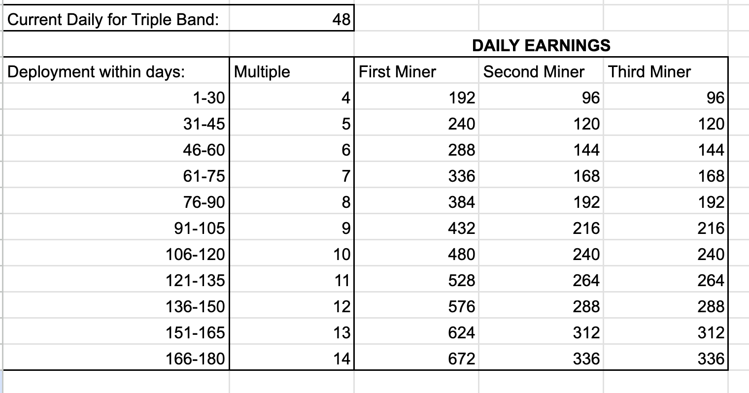 Ok, that's cool Nik. What about the miners? What do we get? As soon as a stake is Active, the first miner deployed into any res5 hex in the SuperHex within the first 30 days will earn a 4X multiple on their mining rewards for one year from the time of the first deployment. Deployment will switch the SuperHex from Active to Producing. If you have a triple band miner (and you bloody well should, they're the highest earning miners in GEODNET), that means as of August 2023 you'll earn 48 x 4 = 192 GEOD tokens/day.