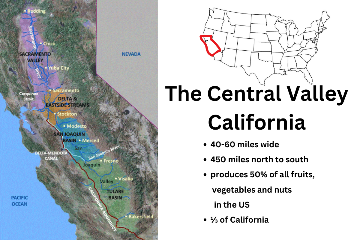 First we’ll do California. California is about 3/4s the size of France, and has at least one relatively small area, the Central Valley, which produces 25% of America’s fruits, nuts, and other food products. The Central Valley is about 20,000 sq miles, which sounds big, but it’s only 1% of all US farmland.