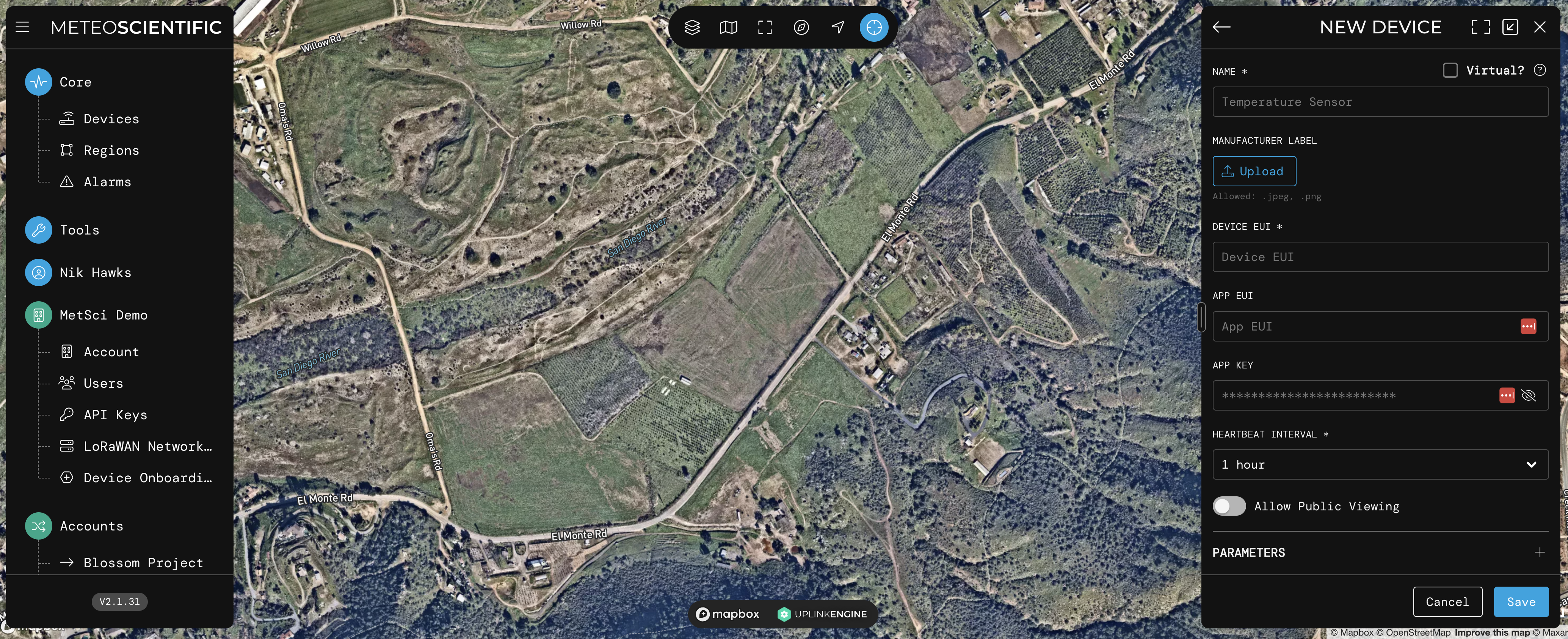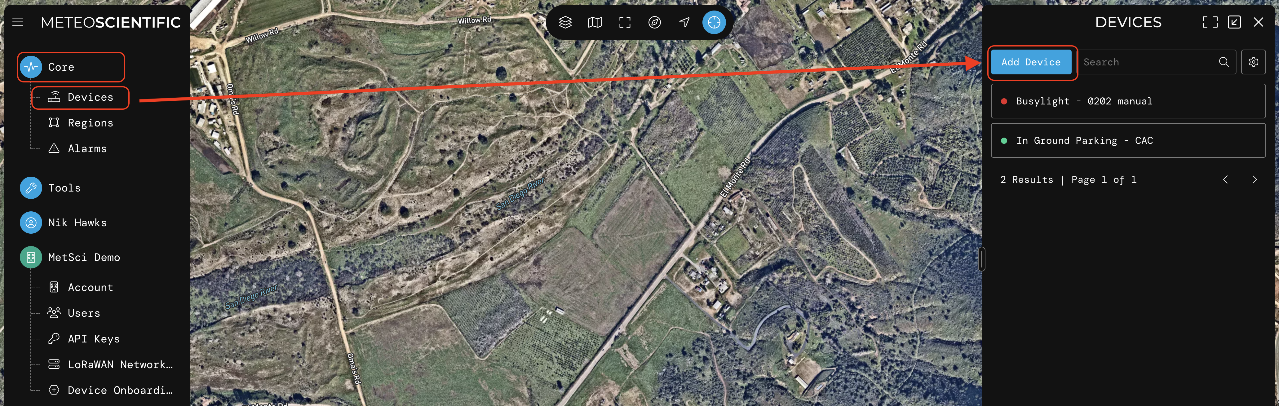 Gather your DevEUI, AppEUI, and AppKey from your Chirpstack account for the Device you want to add, then in the MetSci App, go to Core-->Devices and Add Device, like this: