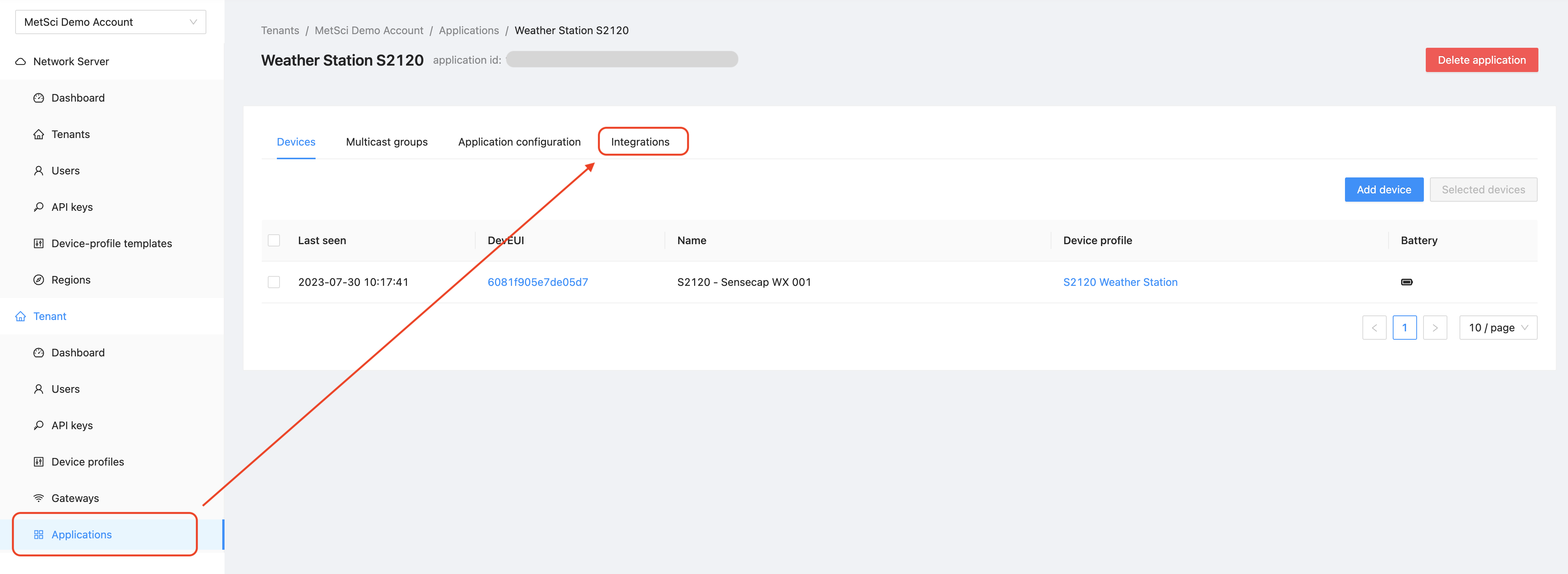 You can see that the sensor is up and reporting packets consistently, and the signal strength is good enough. Now, this is just the Device. To create an Integration, start by finding your Application in Chirpstack. Click on the Application, then look for the Integration tab, like this: