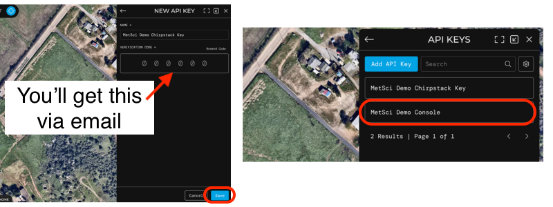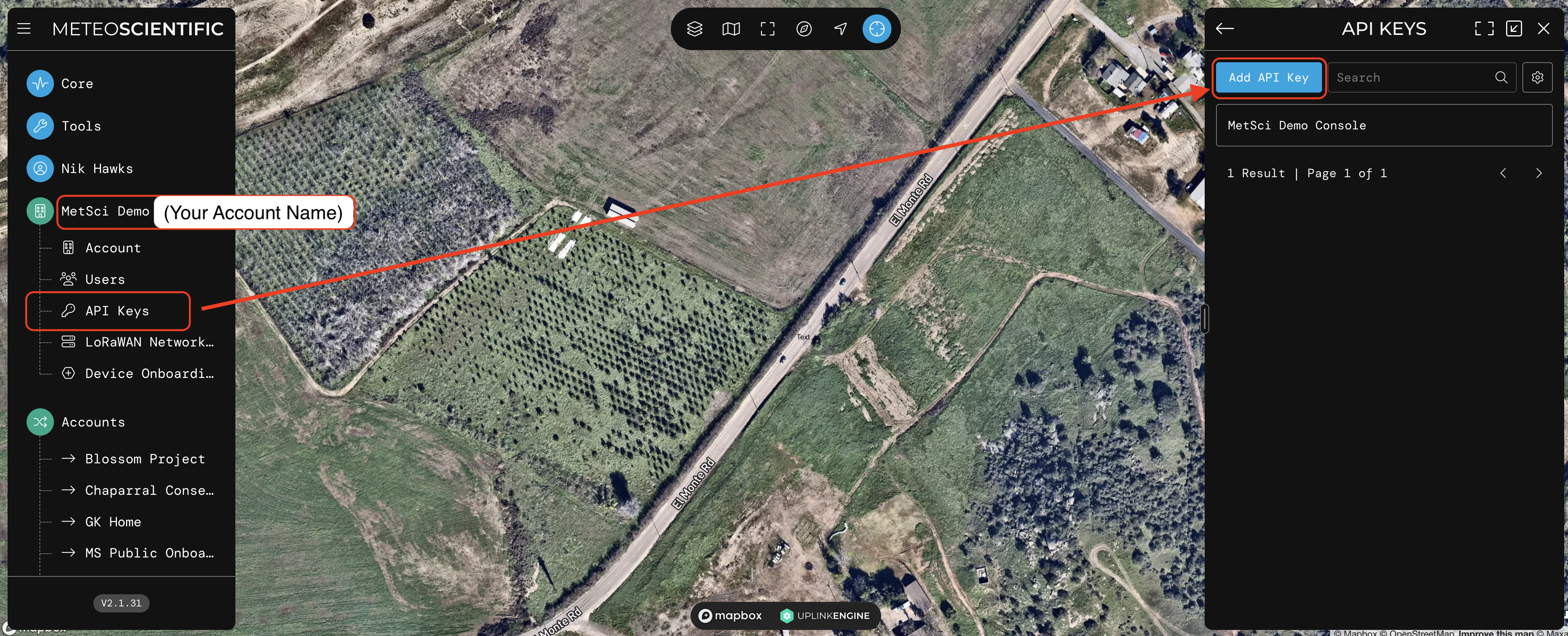 So, over on app.meteoscientific.com, look for your account name, then API Keys, then go to the top right and hit the "Add API Key" blue button, like this: