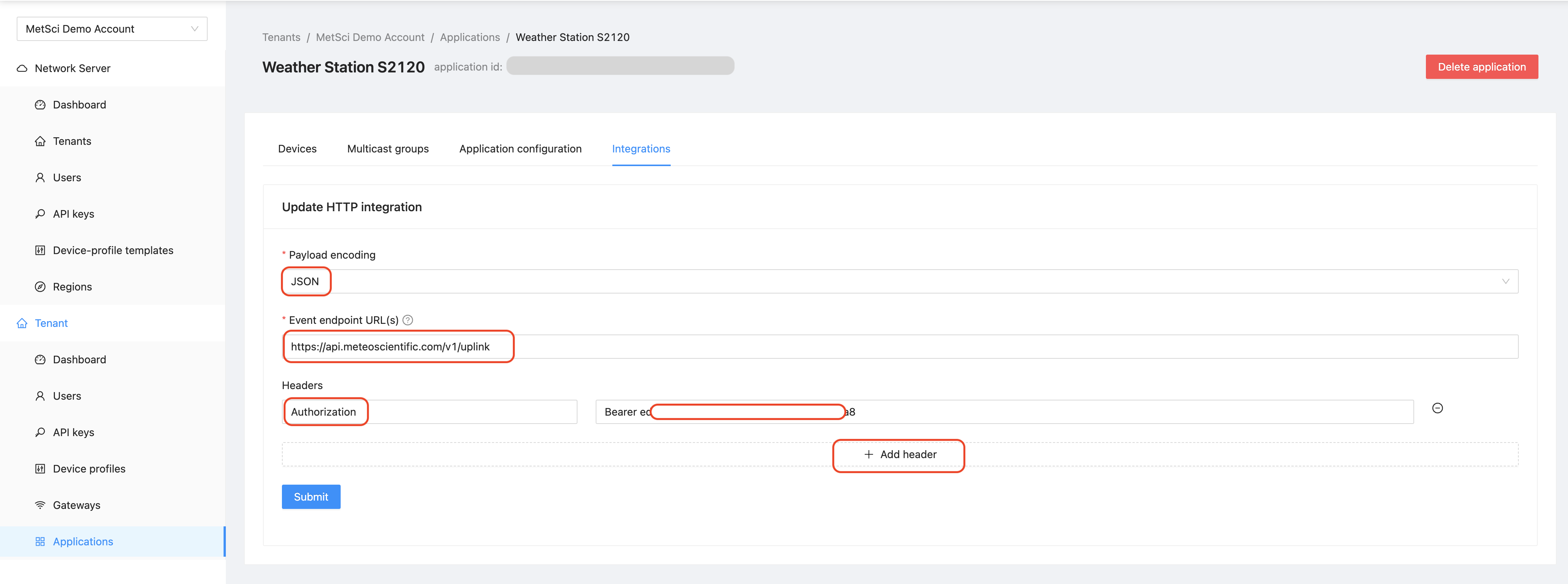 To do that, we're going to open another tab and for our Integration account. In this case, that's the MetSci (MeteoScientific) app. There we'll generate an API key, then copy and paste a few things back into the Chirpstack Integration window.