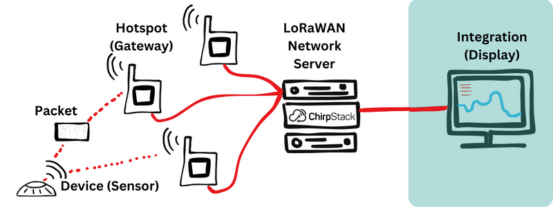 It starts with the Device sending out a Packet over radio waves. That Packet is received by a Hotspot. The Hotspot sends it on to an LNS (LoRaWAN Network Server), which will typically decode the packet and send it on to an Integration.