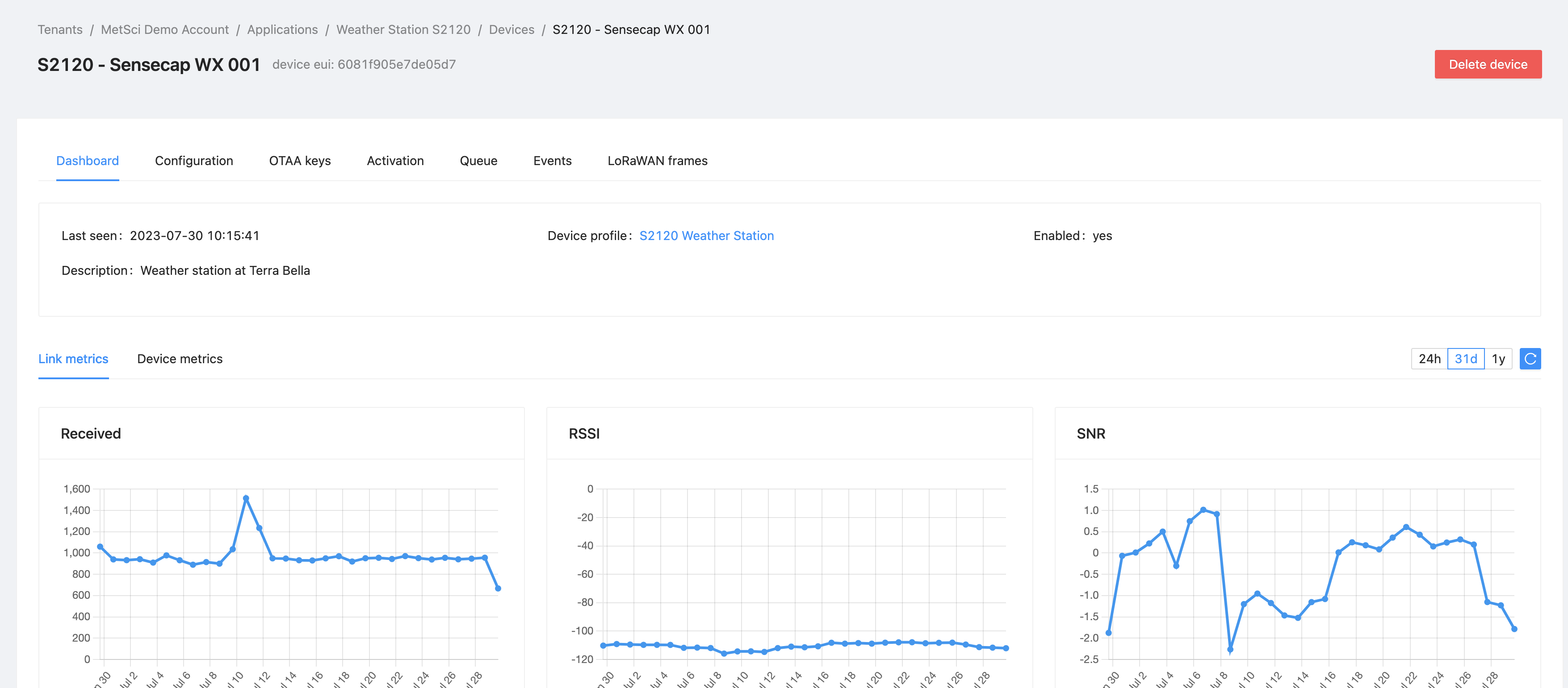 Once you have a device set up, it'll look something like this weather station, which is an example from the Chirpstack LNS on console.meteoscientific.com: