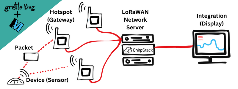The sensor emits a packet, the packet is received by a Helium Hotspot (also known as a "gateway"), that Hotspot sends it to the Helium Packet Router. The Helium Packet Router figures out which LNS to route the packet to and sends it there. At the LNS the packet is received and decoded, then sent out to an Integration, usually to be displayed in a dashboard or sometimes as an alert or notification. Whew!