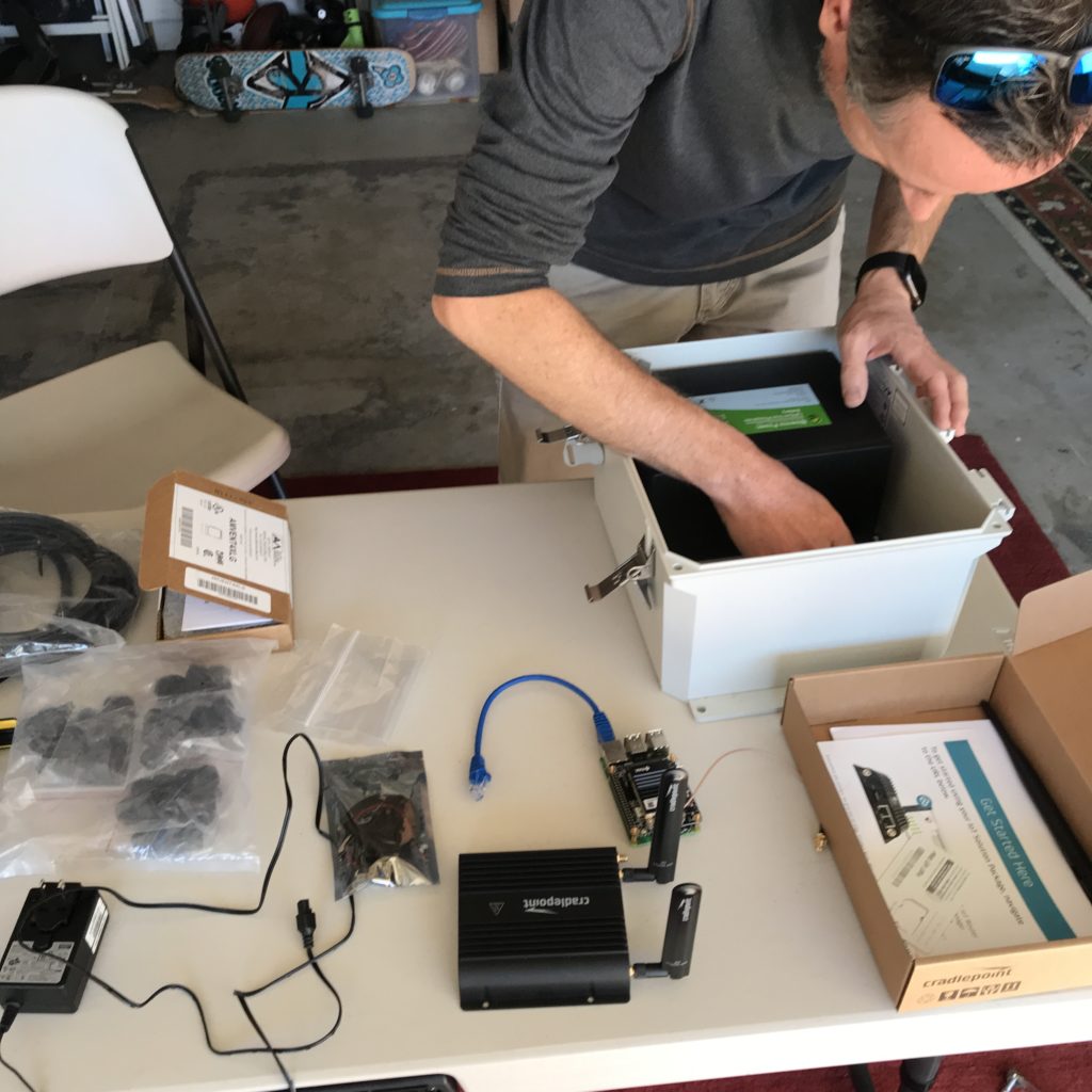 Guided by Paul over at Tourmaline Wireless, who drilled the holes and walked me through the layout, I got the first hotspot put together and ready to hike in. Here's Paul sussing out the best interior setup in his shop.