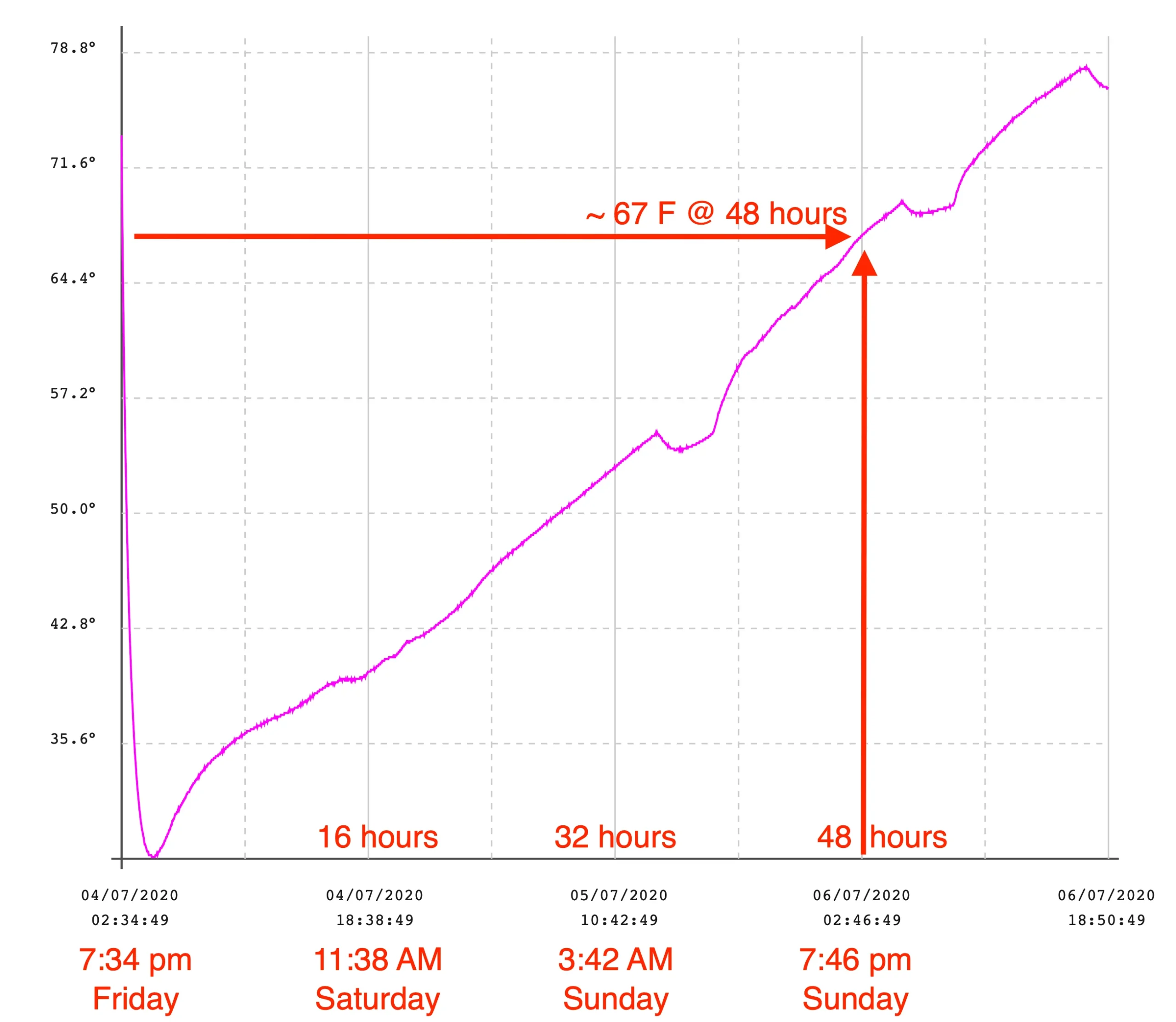 So right off the bat, it makes sense for Paleo Treats or any small business shipping perishable goods to buy a couple Nanotags and just use 'em for in-house testing. Here's a package I sent from San Diego Mempis, then on down to Louisiana. I used Meteo Scientific's Uplink Engine dashboard to keep an eye on it as it traveled. At the beginning it was 34F or so, with the temperature gradually rising to whatever the local environment was over the course of a few days.