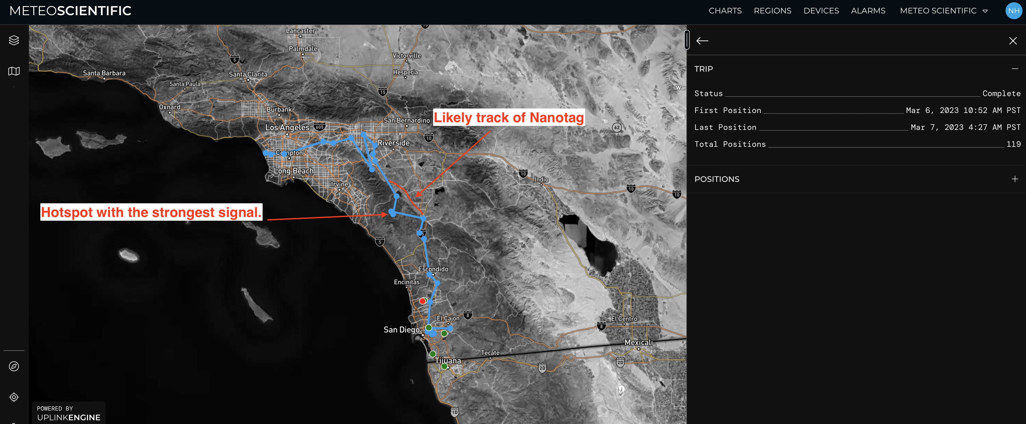 From there, the Nanotag decoder pulls the strongest signal received, and shows you the location of that Hotspot. It's not the location of the tag, which can be a little confusing. Here's what that can look like as a package travels from San Diego to LAX. It's *mostly* accurate, but a few high hotspots with high gain antennas on telco towers can distort the path a bit.