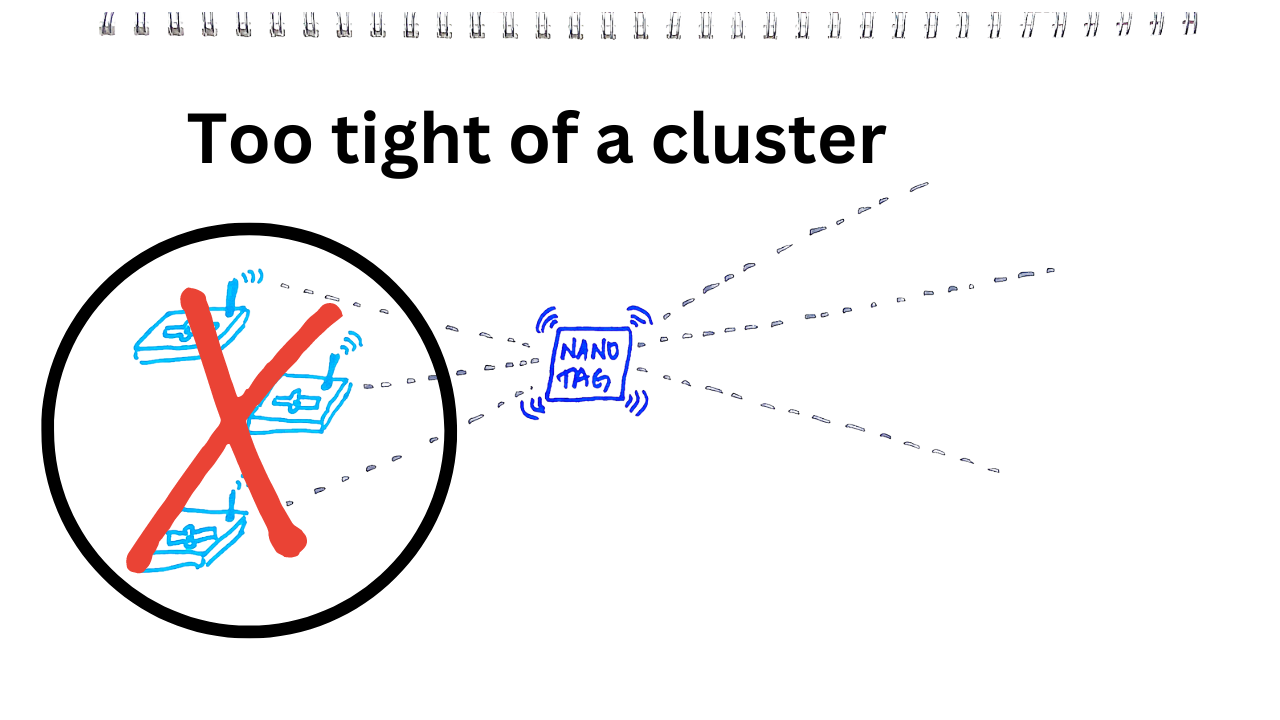 Second, those Hotspots need to be spread out enough from each other. A tight cluster of Hotspots doesn't help narrow down where you are, especially if that cluster is off in the distance. You just can't get a bunch of usefully intersecting lines that way. It looks like it in the first picture, but that's assuming a perfect world with no buildings and a crystal clear air path between tag and hotspots. That rarely happens.
