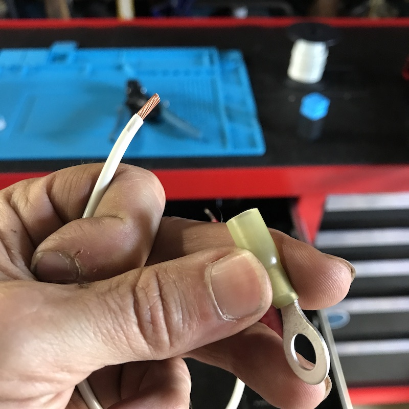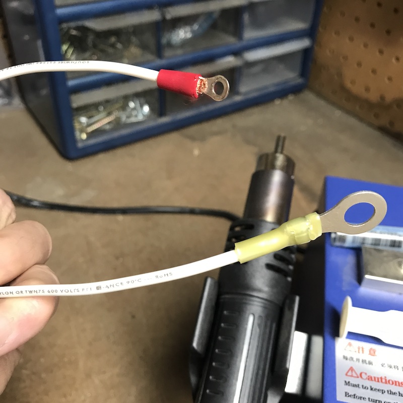 Then I had to make the grounding wire. I used 12 gauge cable for this demo, most specs require 10 or 12 ga. You need to crimp on quick connect terminals to both sides, then seal the heat shrink around 'em. Here's what it looks like with the wire stripped, before I made the connection.