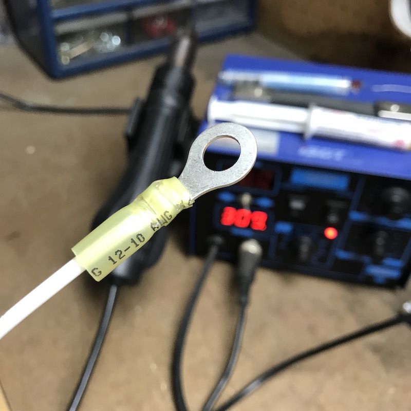 I crimped both sides, used a heat gun (Steinel HL2020E if you must know) to shrink it down all tight and pretty, and I had my grounding wire. You want these to be as short as possible.