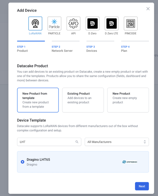 Ok, the next step is confusing. With the LHT65 provisioned in console, you have to tell Datacake AND Console what you've done. In Datacake, look for the blue Add Device button, then choose LoRaWAN --> New Product from template-->then search for LHT and click on the Dragino LHT65 radio button. Like this: