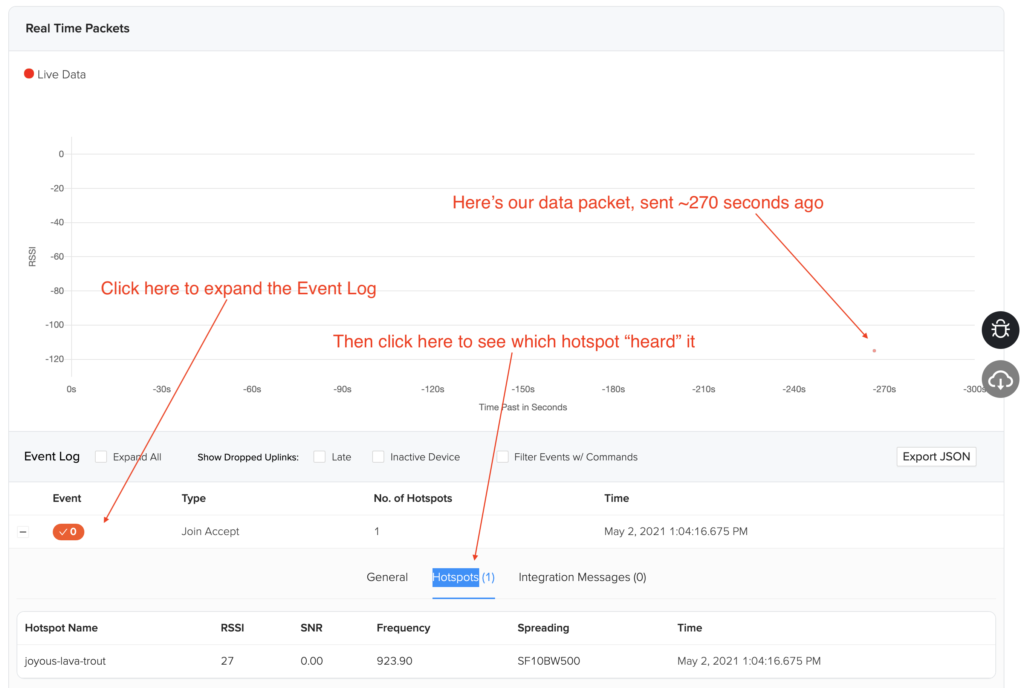 You can watch as nearby hotspots pick it up. Scroll down to the Event Log, open up an Event, then click on Hotspots. That's the hotspot that's "hearing" your device.