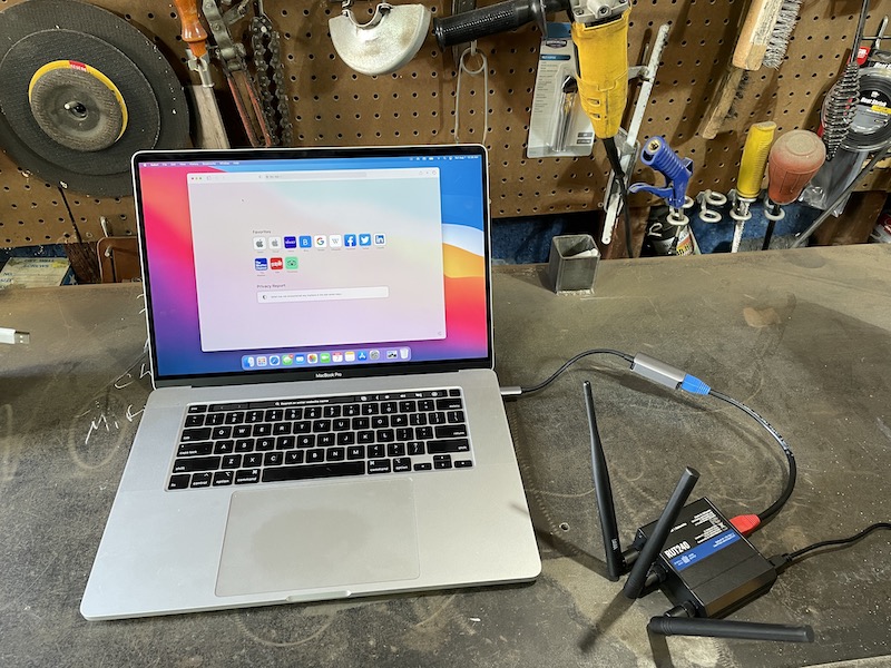 Start by turning off your computer WiFi, then connecting your computer via an ethernet cable to the RUT240's LAN port. I used an adaptor to get from Ethernet to USB-C; you can get those on Amazon.