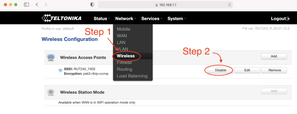 Now navigate to Network --> Wireless, where you'll disable the WiFi. This'll disable the wireless access point and save you power, which is important for off-grid setups :)