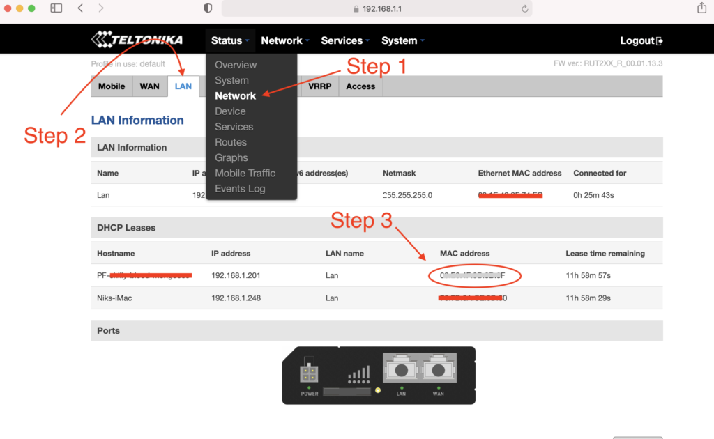 Write down the Router Serial & MAC address, then log into to rms.teltonika.lt