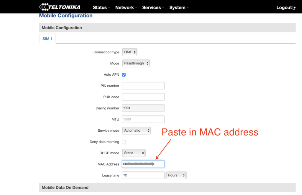 With the MAC address copied, navigate to Network --> Mobile. Look for Mode and select Passthrough.