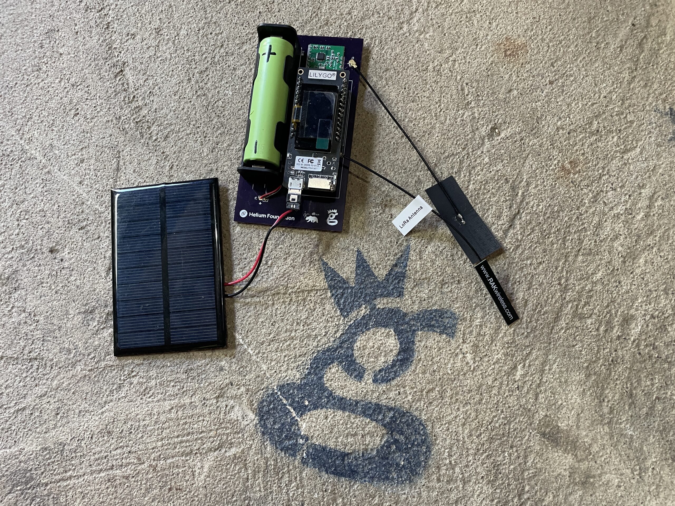 Once you've got it all together, but BEFORE you put in the battery or connect the solar panel, you'll connect to the LilyGo (the thing with the red squiqqly line over it in the picture above) with a PC and program the thing.