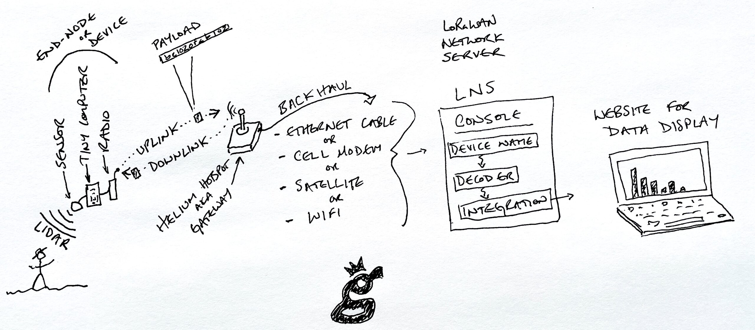 Let's start at the beginning of the system, with the thing in the field. You or I might call it a sensor, but technically a sensor is only the actual thing sensing the data input. In this case, it's a LIDAR sensor. That sensor is connected to a tiny computer, which has a radio module on it. Together, the sensor, the tiny computer, and the radio are called an end-node or device.