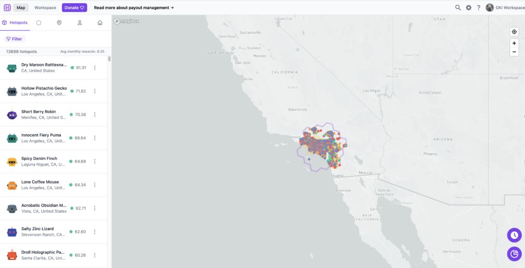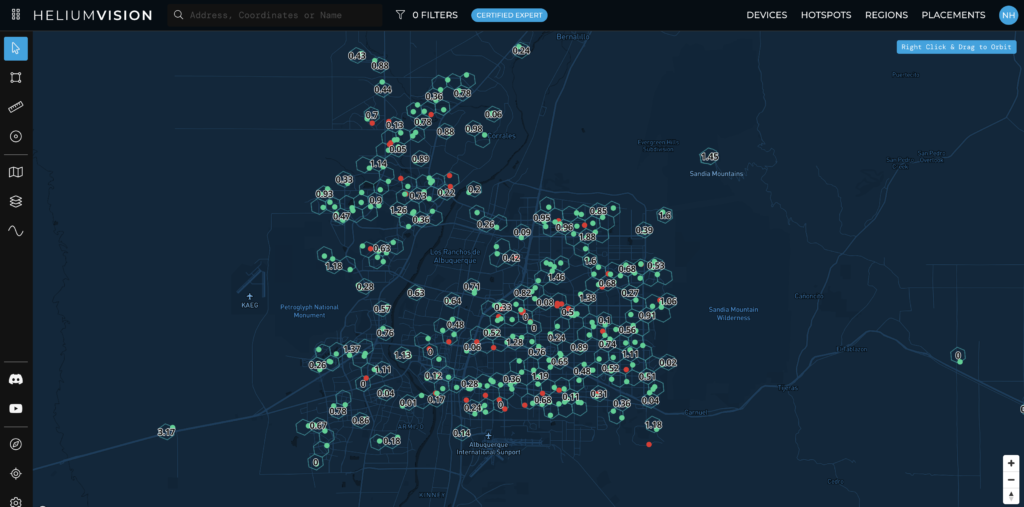 The average monthly HNT earnings of a Hotspot in Albuquerque is around 14 HNT. That may not sound much, but it's higher than anything else I could find, by a lot. I spent some time centering the map in Hotspotty on cities and seeing how many hotspots were there as well as average earnings.